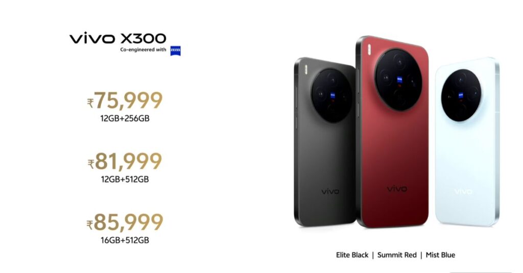 Vivo X300 के 12GB RAM/256GB स्टोरेज वेरिएंट की कीमत ₹75,999, 12GB RAM/512GB वेरिएंट की कीमत ₹81,999 और 16GB RAM/512GB मॉडल की कीमत ₹85,999 है।